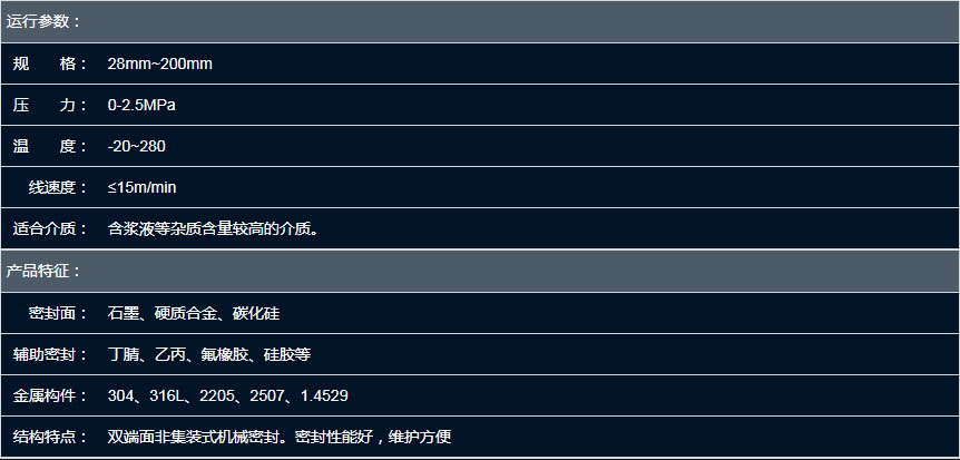双端面非集装式机械密封。密封性能好,维护方便。非平衡性,任意旋向。