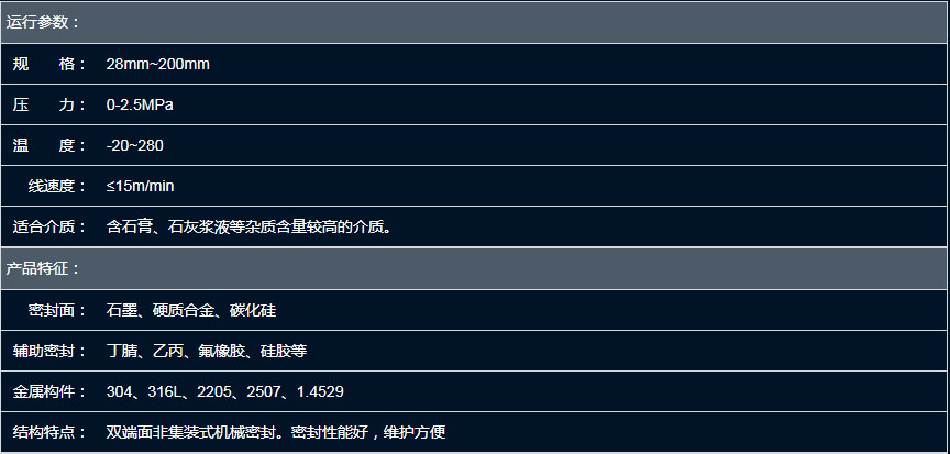 此型机械密封主要用于燃煤发电烟气脱硫上,适用于吸收塔浆液循环泵、石膏浆液泵、石灰石浆液泵、石膏排出泵。